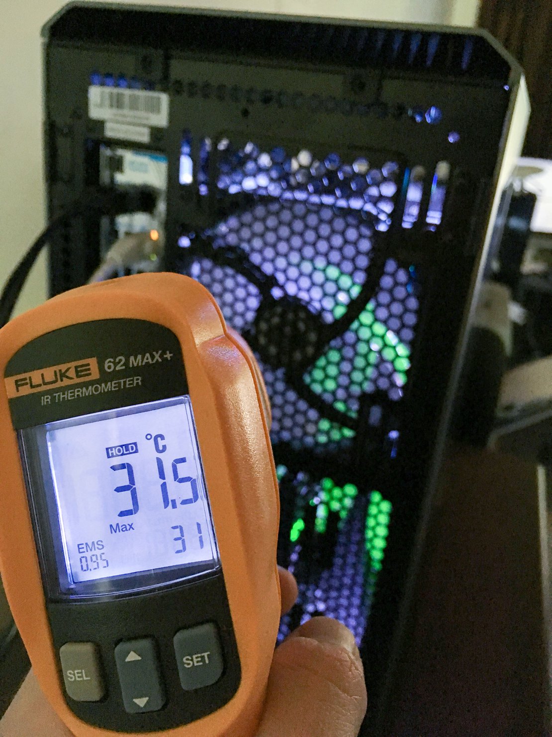 PS: I know I used an IR temperature meter - but if you remember basic thermodynamics, the air temperature will be in equilibrium with the temperature of its surroundings provided those surroundings do not generate internal heat - such as the blades of the fans.